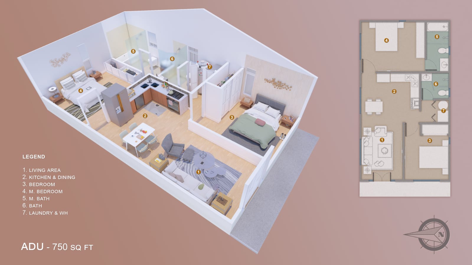 - Detached ADU - An independent unit separate from the primary dwelling.